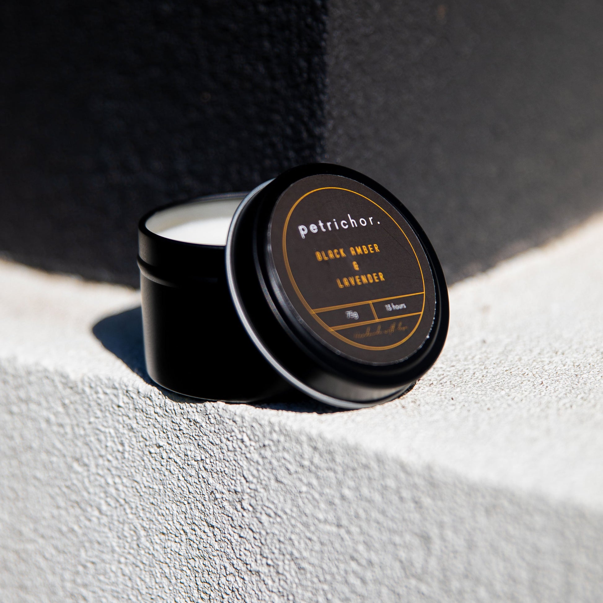 - Container: Matte black tin
